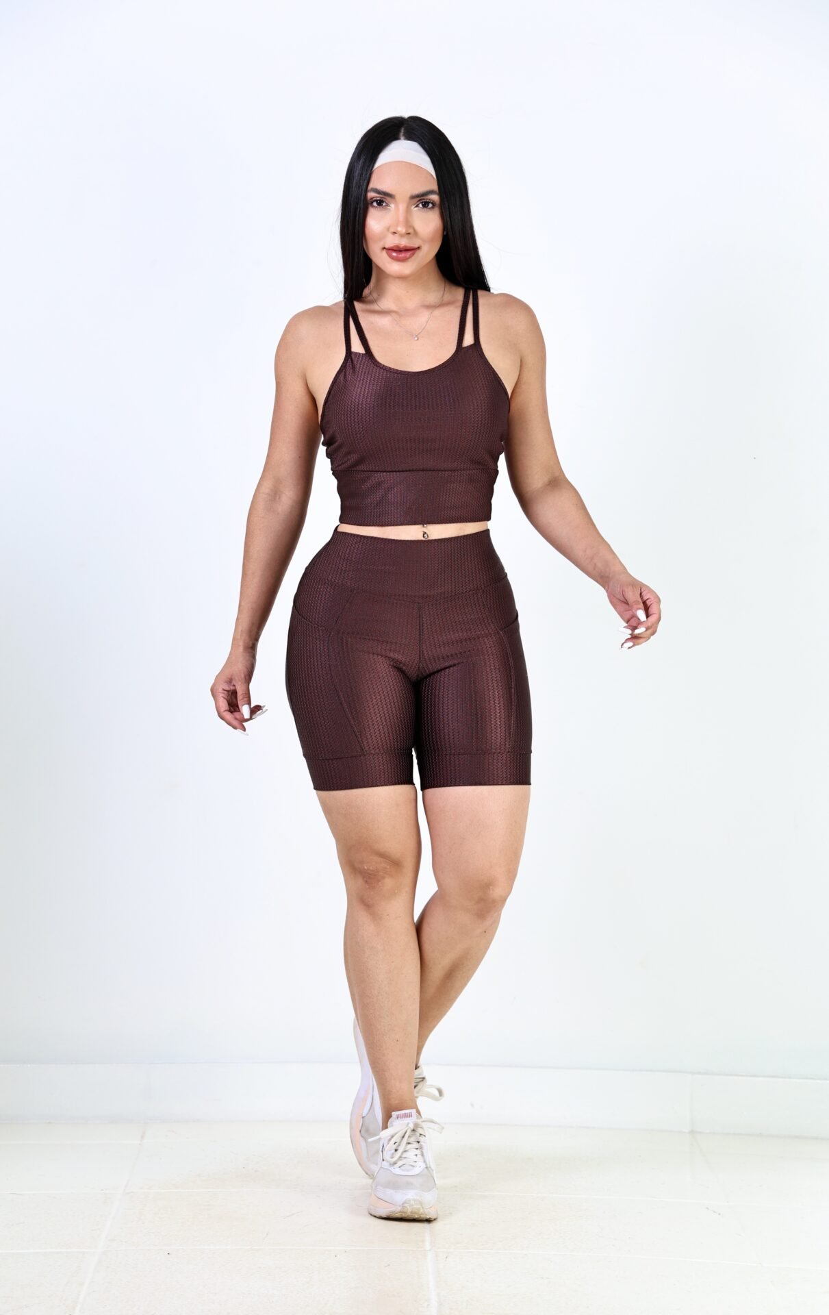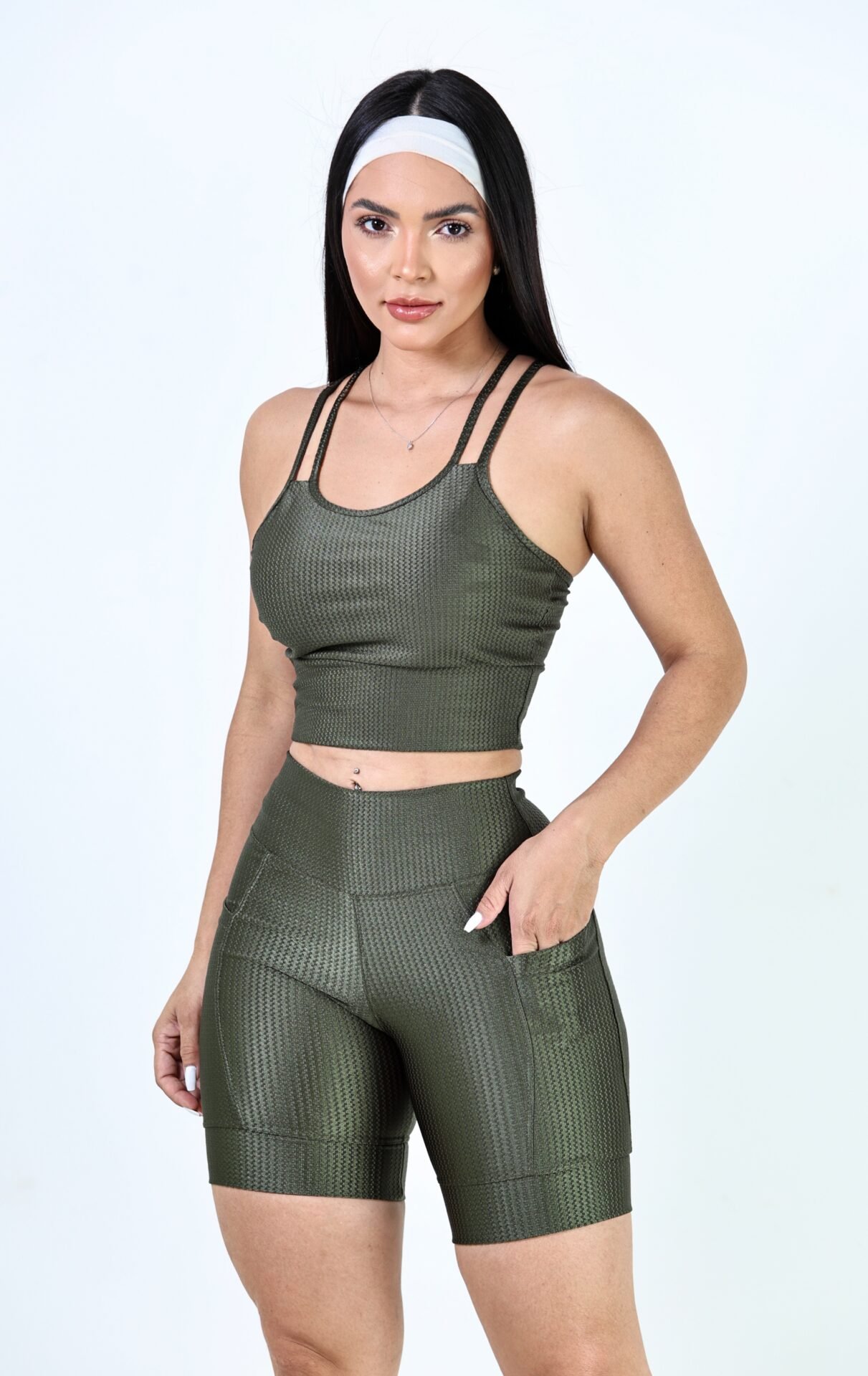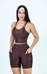 Top com alças finas duplas cruzadas nas costas, que garantem charme e sustentação. A bermuda possui bolsos laterais funcionais, ideal para trazer praticidade nos treinos e no dia a dia.